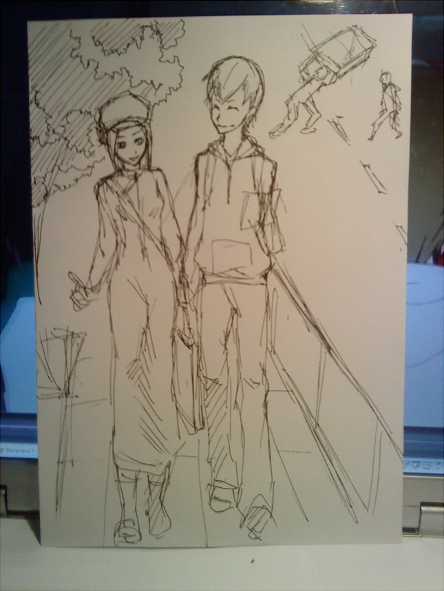途中收到V的短信“想畫正面輕快地走路,雙手背後的姿式”……
